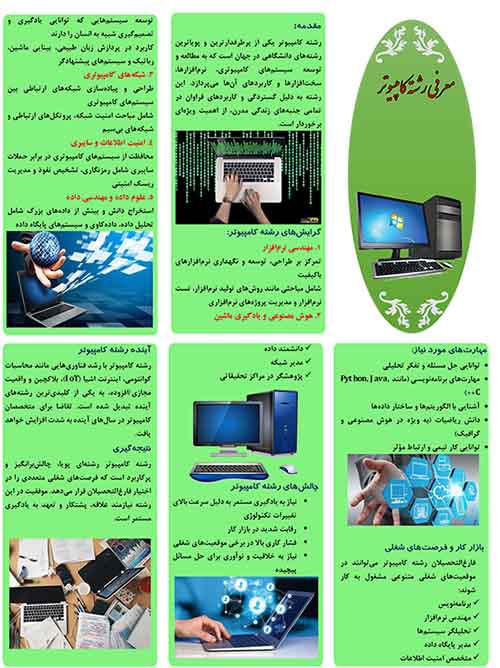 "تصویر صفحات برشور معرفی رشته کامپیوتر شامل گرایش‌ها، بازار کار و مهارت‌های مورد نیاز"